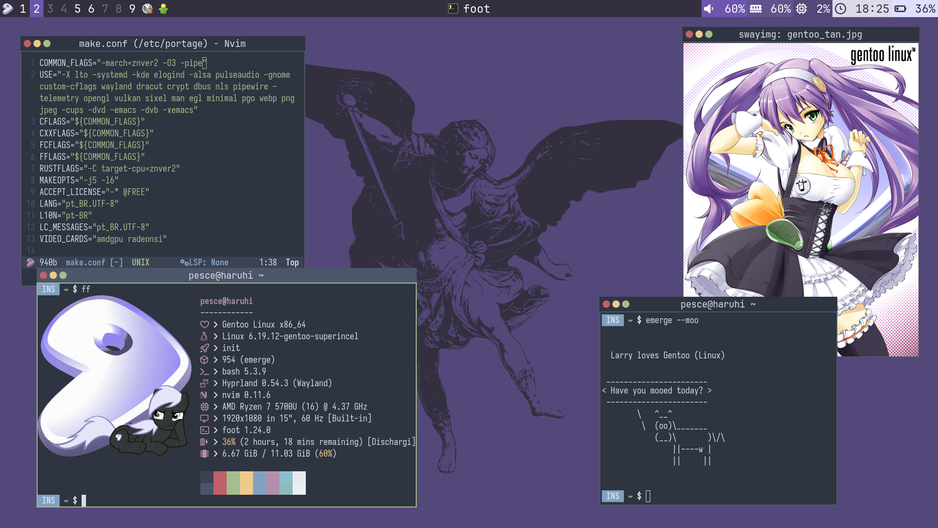 Outra coisa que detesto bastante é o fato do portage ser feito em python. Não me leve a mal, portage enquanto ferramenta é muito foda! Mas pelo fato de ser feito em python, acaba sendo mais lento do que deveria. É possível contornar isso com algumas ferramentas alternativas do gentoolkit e o próprio eix, mas isso serve somente para queries de pacotes. Se isso for algo que te incomode bastante, você ainda pode testar o exherbo que usa o paludis (c++) como package manager.